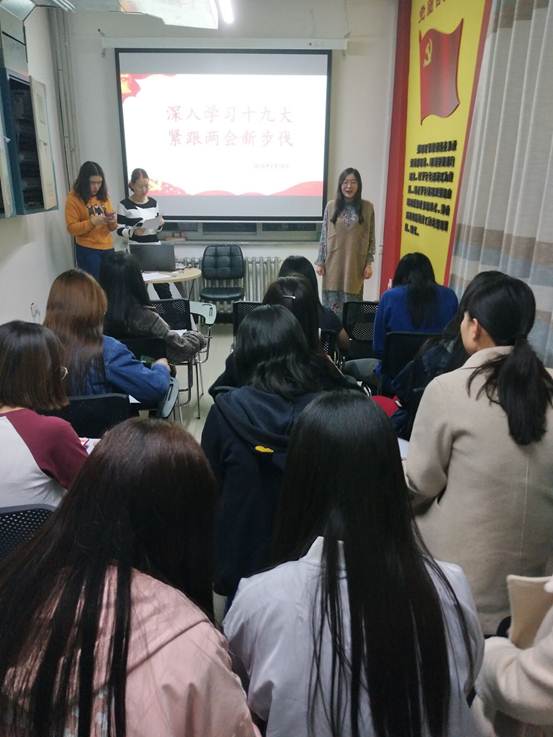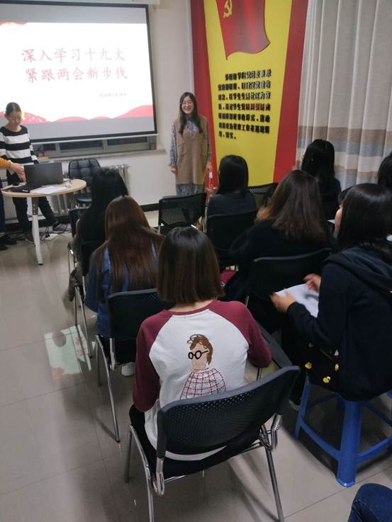 gcgc黄金城集团团组织部于2018年3月18日晚7点,我院党员与团小组在16号楼135党员活动室开展时事政治学习系列活动之“深入学习十九大,紧跟两会新步伐”。活动主讲人为党员王予彤和韩文霞,参与活动的团小组为17级1班第一及第二团小组。